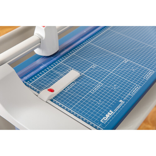 The 446S Large Format Premium Rotary Trimmer with Stand from Dahle is designed for precision trimming of paper and thicker material. It features a ground self-sharpening blade with an extruded aluminum guide bar for strength and accuracy. The integrated, automatic clamping system provides even pressure that prevents work from shifting when you're making long cuts. The self-sharpening cutting system sharpens as you cut to maintain a perfectly honed edge. The blade's precision-graduated edge will remove even the tiniest sliver of paper and produce a clean, burr-free cut for up to 22 sheets at a time. Precisely screened alignment guides indicate imperial and metric measurements for achieving the exact length you need.